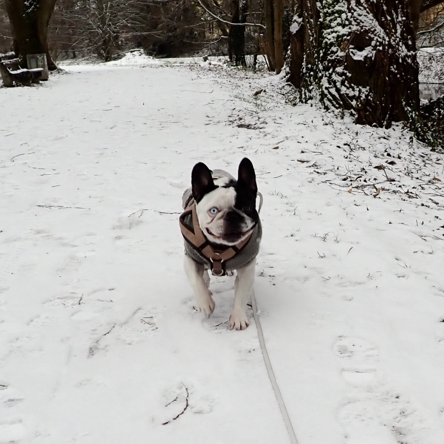 An der Leine hört sie gut und beherrscht die gängigen Grundkommandos. Aufgrund der aktuellen Situation ist sie sehr aufgeregt (viele wechselnde Gassigänger, da Frauchen im Moment nicht kann) und freut sich riesig über das Gassigehen. Dadurch ist sie viel "im Außen". An der Leinenführung und an Hundebegegnungen sollte jedoch noch gearbeitet werden. Gerne auch in Begleitung mit einem Trainer/einer Trainerin. Bulldoggen-typisch ist sie ein kleiner Sturkopf.
