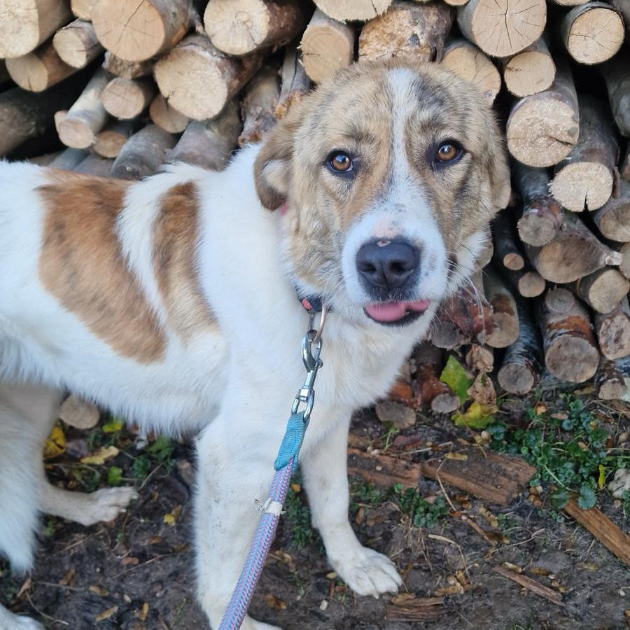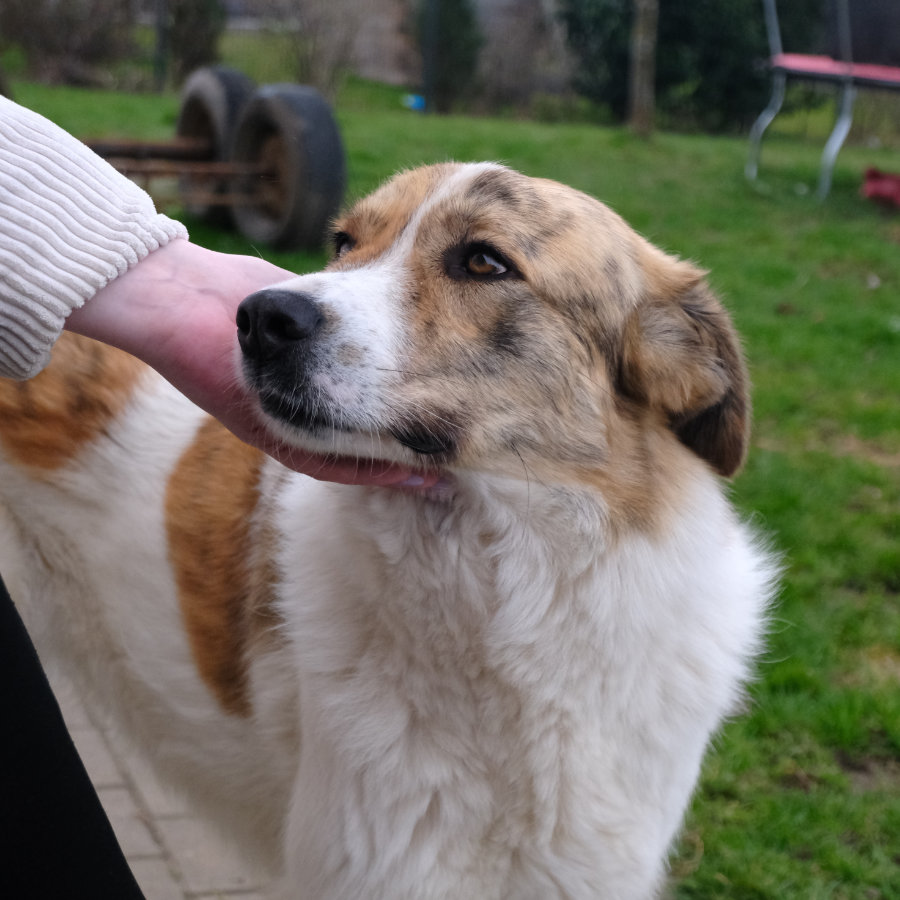 Baby (ca. 4 Jahre und ca. 75 cm) erinnert sowohl optisch als auch charakterlich stark an einen Herdenschutzhund-Mix: loyal, feinfühlig und sehr menschenbezogen, sobald sie Vertrauen gefasst hat. Bei fremden Menschen verhält sie sich zunächst noch zurückhaltend, öffnet sich aber mit Geduld und Einfühlungsvermögen und zeigt dann ihre verschmuste und liebevolle Seite.