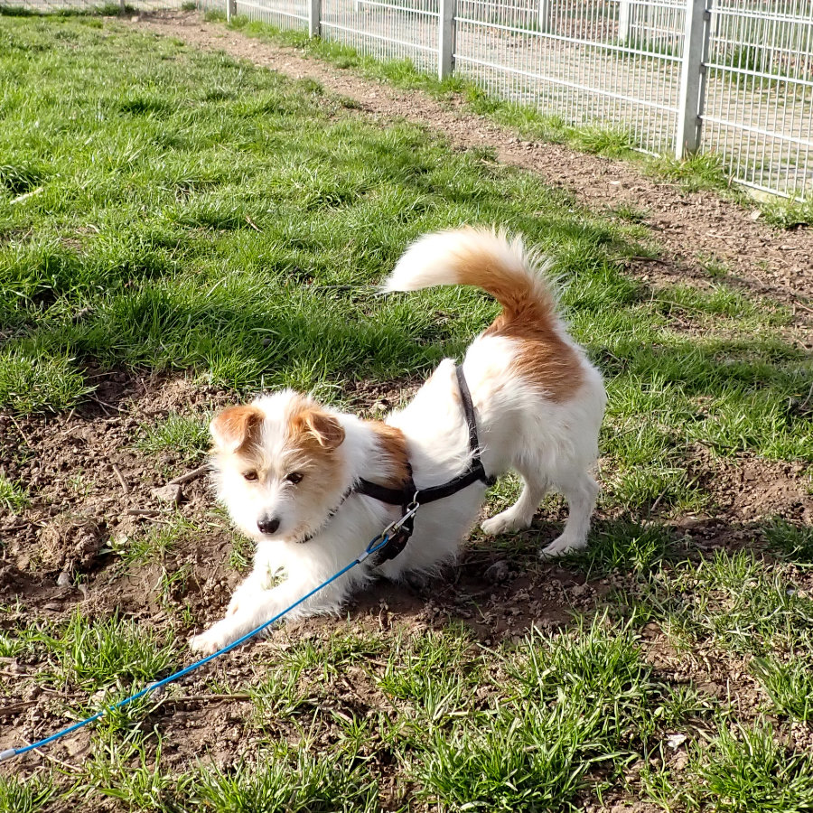 Wir üben fleißig das an der Leine gehen, da solche Sachen für sie noch komplettes Neuland sind, aber sie lernt schnell und passt sich selbst sehr bereitwillig an, wenn sie merkt, dass nicht schlimmes passiert. Mit anderen Hunden ist sie bedingt verträglich, typisch Terrier ist sie anfangs laut und verbellt die anderen, im direkten, geführten Kontakt zeigt sie sich dann aber schnell angepasster und ist auch hier zeitweise mit anderen Hunden zusammen. Am besten funktioniert es hierbei mit souveränen Hunden, die selbst gut verträglich sind und gemäßigt auf andere zugehen. Starke Hektik und Dynamik überfordern sie im Erstkontakt.